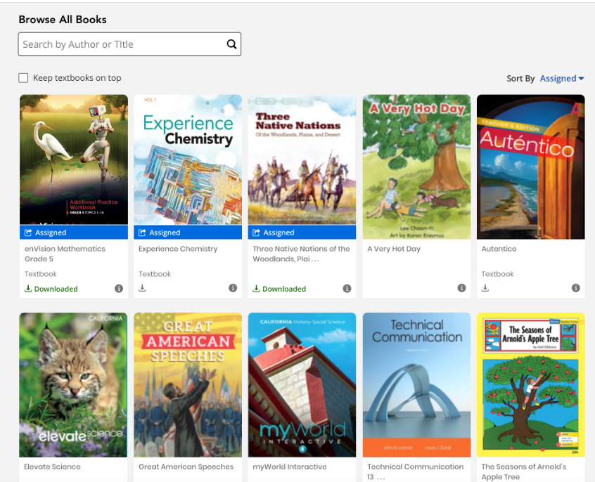 The Assigned status indicates your book has an assignment that you have not completed. The bookshelf displays your assigned books first, followed by unassigned books.
