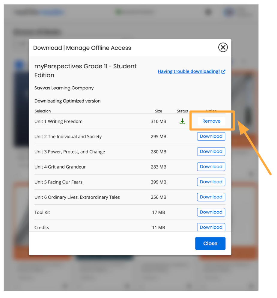 In the Manage Offline Access window, press the Remove button to remove any downloaded sections.