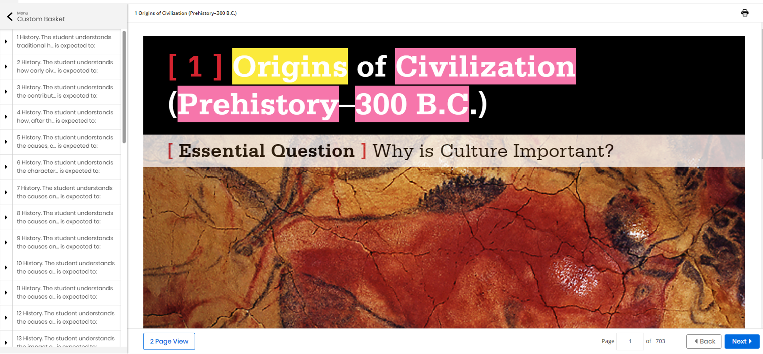 The Custom Basket, available in Realize Reader Selected Reading Realize Reader Selected Reading (RRSR) opens in a new window that displays the entire book and enables the completion of the activities using the full set of Realize Reader tools and navigation features. only, is a mini-Table of Contents used by some publishers and texts to provide state- or institution-specific requirements.