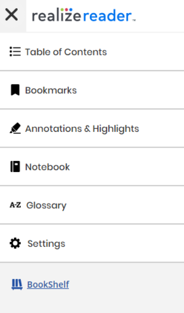 Use the Realize Reader Settings features, available in Realize Reader Selected Reading Realize Reader Selected Reading (RRSR) opens in a new window that displays the entire book and enables the completion of the activities using the full set of Realize Reader tools and navigation features. only, to personalize your reading experience. Your choices are immediately applied so you can try different settings to find what works best for you. You can: