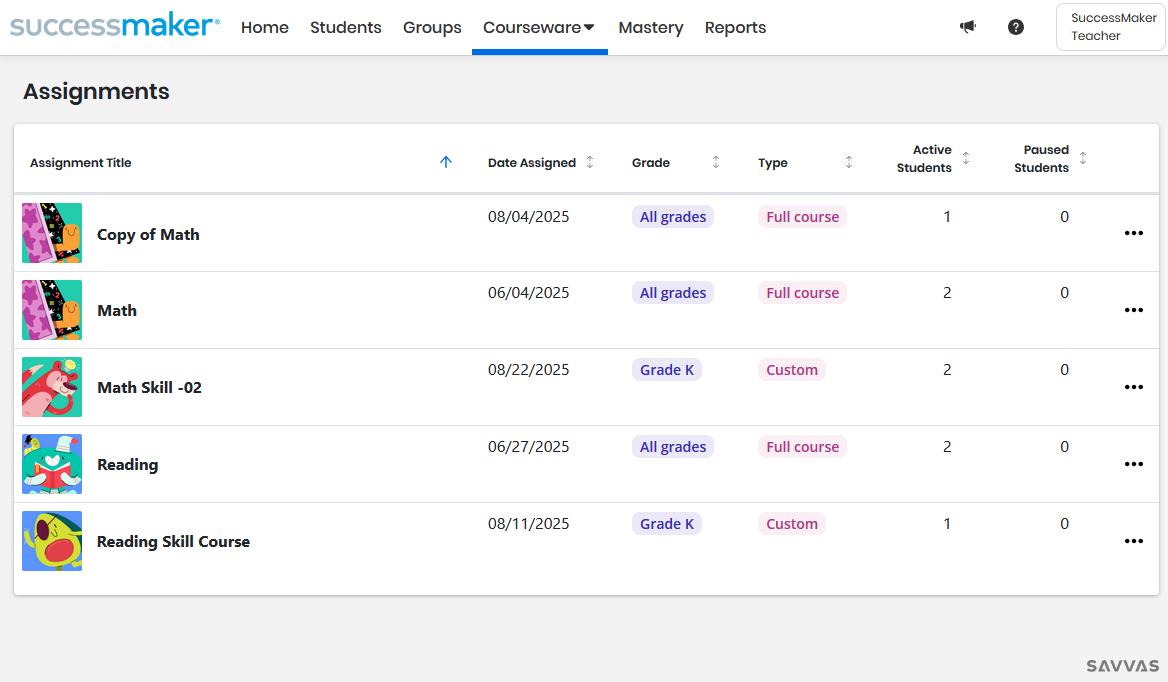 For each assignment, you can see the Assignment Title, Date Assigned, Grade, Assignment Type, number of Active Students, and number of Paused Students.
