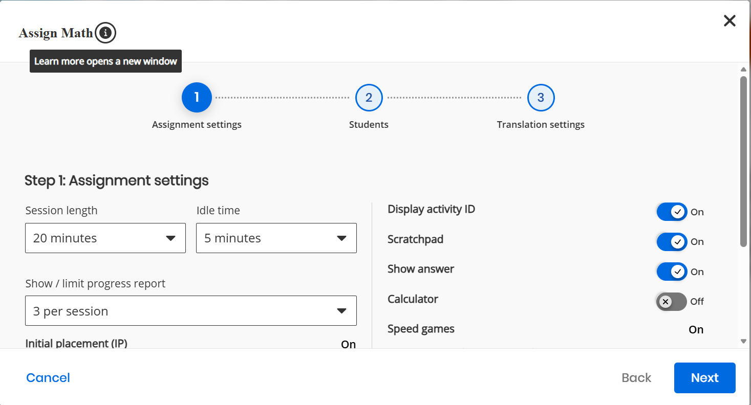 Step 1: Assignment settings - The teacher can set basic assignment settings, like Session length, Idle time, and options to display the Progress Report.