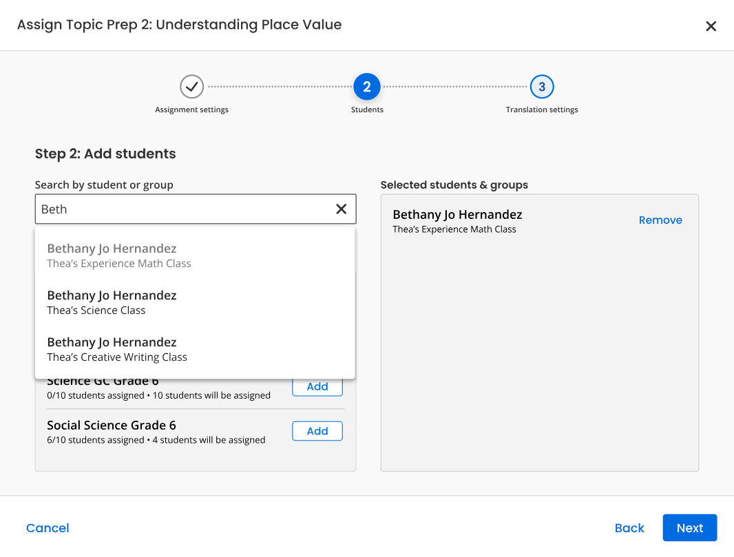 Step 2: Add students - Add students, groups, and classes to the assignment.
