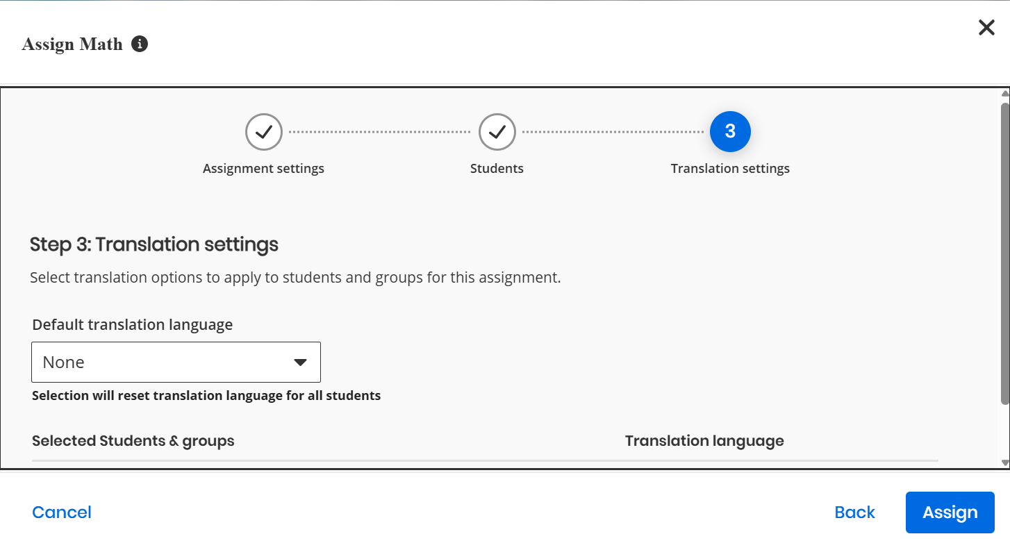 Step 3: Translation settings - Select translation options to apply to students and groups for this assignment.