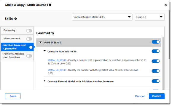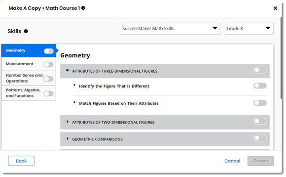 When creating a custom course, in the Skills dialog box, first select a skills framework, and then a grade level for the course. The strands for the selected grade level display in the left panel.