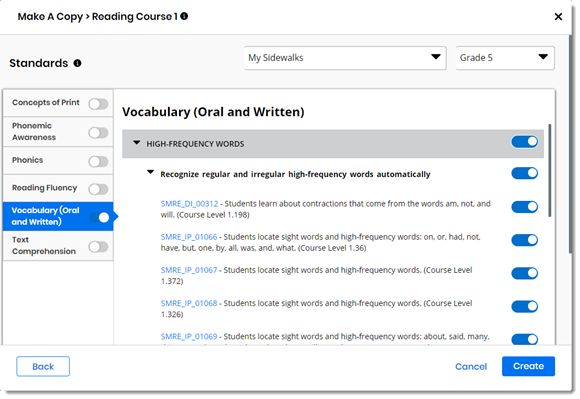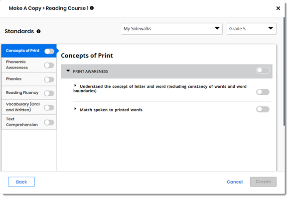 When creating a custom course, in the Standards dialog box, first select a standards framework or Savvas core program, and then a grade level for the course. The strands for the selected grade level display in the left panel.