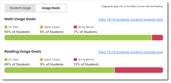 The Usage Goals page displays your students' progress toward usage goals for default Math or Reading courses. You can set unique time-on-system goals for your student even if your student is a shared student in other teachers' groups.